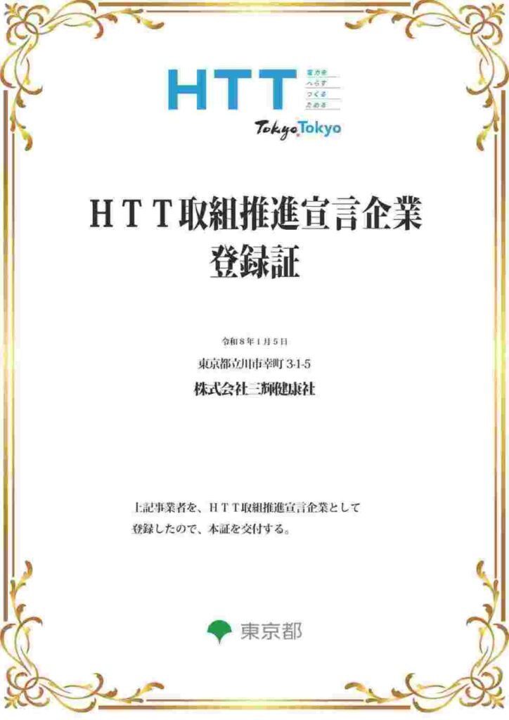 このたび、当社、株式会社三輝健康社は東京都が推進する「HTT取組推進宣言企業」に登録されましたので、ご報告いたします。